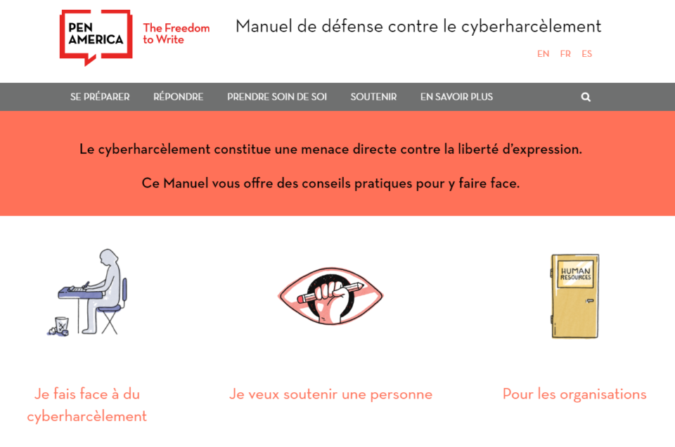 Mais les individus, les journalistes, les blogueurs et autres rédactions peuvent désormais se protéger par eux-mêmes en utilisant le manuel de défense contre le cyberharcèlement développé par PEN American. Il est possible de le consulter en ligne à l’adresse. Le guide, adapté par des journalistes et des spécialistes basés en Afrique de l’Ouest et en France, est disponible en français mais aussi en anglais et espagnol.