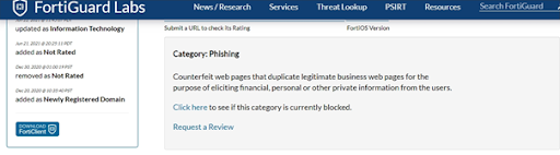 Une analyse antivirus du site suspect avec la plateforme de veille des menaces, Fortiguards Labs a révélé la présence d’éléments potentiellement dangereux et classe ce site dans la catégorie d’hameçonnage.