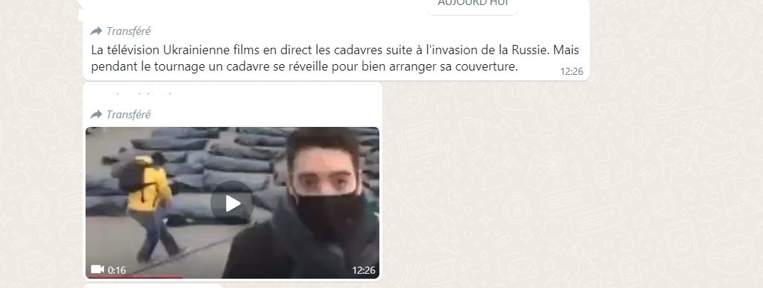 “La télévision ukrainienne filme en direct les cadavres suite à l’invasion de la Russie. Mais pendant le tournage un cadavre se réveille pour bien arranger sa couverture.”, c’est le message qui accompagne cette vidéo de 16 secondes populaire sur WhatsApp et Twitter. Elle montre des dizaines de corps alignés sur le sol avec des housses mortuaires.