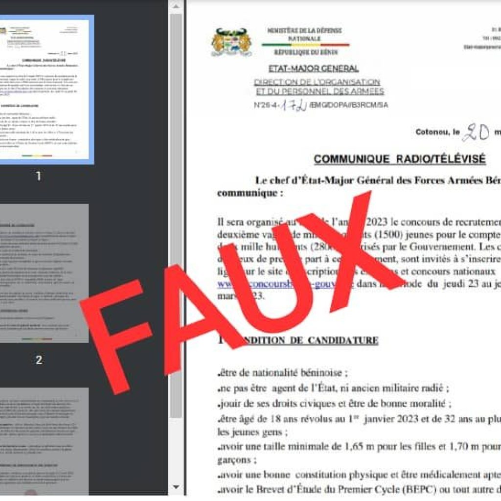 Un communiqué en date du 20 mars annonçant le recrutement de 1500 jeunes dans l’armée béninoise, circule depuis peu sur les réseaux sociaux. C’est une fake news. L’Etat n’a pas lancé un tel concours. Voici 6 éléments qui discréditent l’annonce.