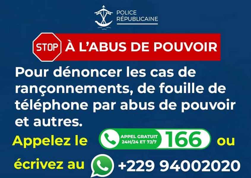 Les agents indélicats sont passibles de sanctions et les usagers sont encouragés à dénoncer les violations de leurs droits aux numéros 166 (appel gratuit 24h sur 24 et 7j sur 7) et +229 94002020 (messagerie Whatsapp).