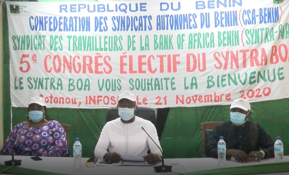 Les militants du Syndicat des travailleurs de la Bank of Africa Bénin (Syntra BOA Bénin) étaient réunis en congrès ce samedi 21 novembre 2020. La rencontre s’est tenue à Cotonou et marquait le cinquième congrès ordinaire de l’organisation syndicale. Le renouvellement de l’équipe dirigeante du bureau directeur était la principale activité inscrite à l’ordre du jour des discussions qui a connu la participation du secrétaire général de la Confédération des syndicats autonomes du Bénin (CSA Bénin).