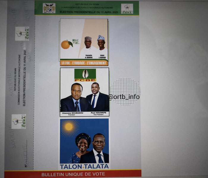 Le premier duo de candidats qui figure sur le bulletin unique est celui de Corentin Kohoué et Irenée Agossa. Ensuite, vient en deuxième position, le duo Alassane Soumanou et Paul Hounkpè. En troisième et dernière position, le duo Patrice Talon et Mariam Chabi Talata.